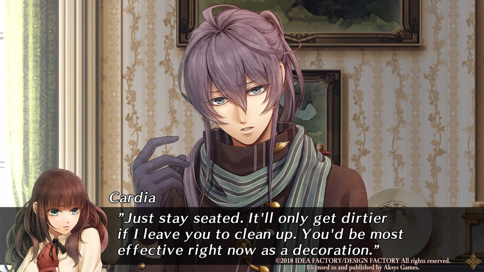 Teoretycznie powinnam kochać ten route miłością nieprzebrzmiałą. Toczy się on podczas ścieżki wspólnej, kiedy jeszcze nic się nie spieprzyło po królewsku, a Cardia nie ucieka od chłopaków z silnym postanowieniem niewciągania ich w swoje rodzinne wojenki. Tak więc mamy tutaj do czynienia z samodzielną przygodą niezwiązaną z wątkiem Beckforda, dlatego choć stawki są mniejsze, to pole do popisu większe i chłopaki z Cardią na czele mogą się zabawić. I ten przepis się spisuje... do czasu. Lupin's Gang! wprowadza nowe postacie - rodzinę mafijną Gordonów, a dokładniej jej głowę Dariusa, młodziutką spadkobierczynię Shirley oraz bodyguarda dziewczyny, Passy'ego. Po drugiej stronie barykady stoi Avido Crudele, antagonista tego scenariusza, posiadający długą historię prowadzenia zatargów z Gordonami. Chociaż route oferuje kilka fajnych pomysłów typu Cardia znajdująca pierwszą przyjaciółkę i spędzająca z nią quality girl time, to przez całą dramę związaną z łzawą przeszłością i mafijnymi porachunkami brnęłam jak przez bagno. Beznadziejnie przedstawia się zwłaszcza Avido, który z jednej strony jest totalnie przerysowany w swoim okrucieństwie i knuciu, a z drugiej wypada na kompletnego idiotę niezdolnego do trzymania się najprostszego z planów. Gdy grupa uznanych osobistości wbija ci na statek pełen koksu, żeby ci ten statek przejąć i pokrzyżować szyki, co robisz? No jak to co, grozisz im palcem, śmiejesz w twarz, a potem pozwalasz biegać po łajbie i kombinować jak im się żywnie podoba. Darius jest całkiem sympatyczny, ale to tyle dla tej postaci i podobnież można podsumować Shirley, z tą różnicą, że gdy fabuła nie ma na nią pomysłu, to zamyka się ją w składziku. Naprawdę, nic nie zmyślam, tak było. Jeżeli nie interesują was przygody kradnących pierwsze skrzypce na parę godzin randomów, to warto się na tę przejażdżkę zabrać dla chłopaków. Och, fanserwis w tym rołcie pierwsza klasa - nawet pies świetnie się prezentuje we fraku, to wyobraźcie sobie resztę! Każdy z amantów dostaje moment na popisanie się i przejście po sprajtowym wybiegu, tak więc jeżeli szukacie nowej tapety, to nie musicie szukać dalej. Nawet Sherlock jest tu fajny - coś, co nie zdarza się w jego ścieżce, więc kochajcie to całym sercem.